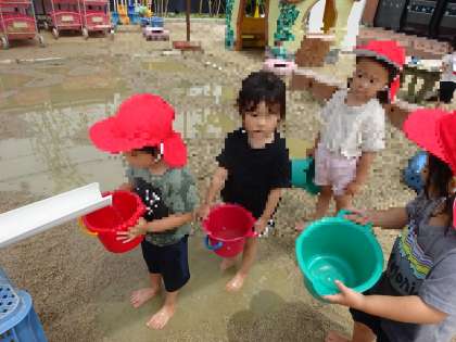 最後はみんなでシャワーを浴びて、「きゃ〜!!」と言いながら、水の心地よさを感じ喜んでいました。来週からのプール遊びにつながるといいなと思います。