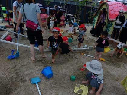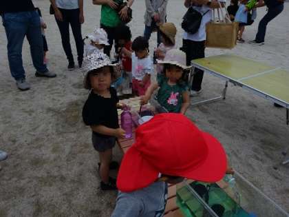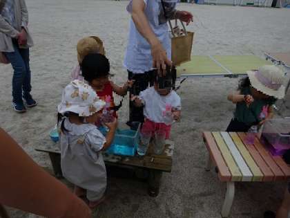 色水遊びと、泥遊びを準備しました。 3歳児の子どもたちと一緒に遊んでいました。