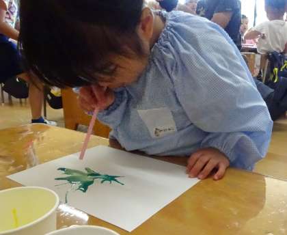 絵具が紙の上をのびていくと、「うわぁ!こっちにいった〜」と嬉しそうでした♪