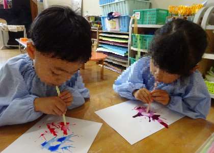絵具をたらして、ストローで「ふぅー」っと吹いて、吹き絵をしました!