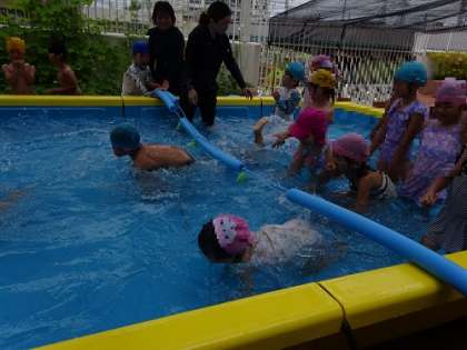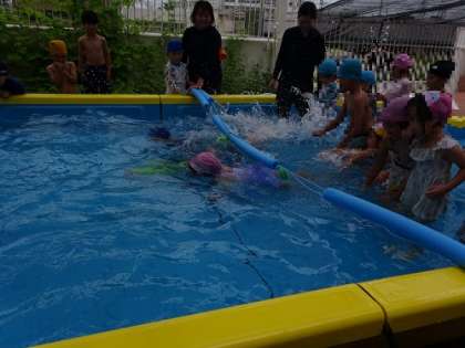 プール遊び(5歳児) 公開日 2023/07/03 更新日 2023/07/03 お知らせ 5歳児は、顔を水につけたり、足を伸ばしたり、それぞれの目標に向けて楽しんでいます。 まず、先生の見本から!とばかりに、先生たちも潜ったり、顔を水につけたり頑張っています。 ナイスファイトです! (年長の先生は、プール遊びのために今日はすっぴんで来たそうです…) いいね(0)