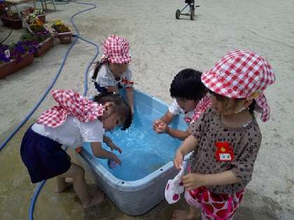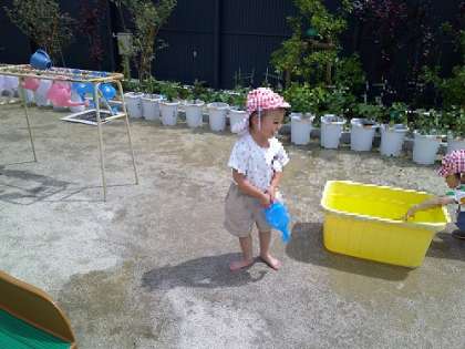 すくすくランドの子どもたちは、水遊びをしたり、泥遊びをしたりして遊びました。