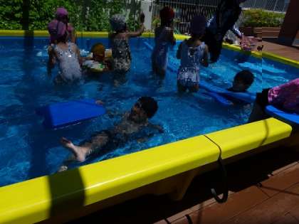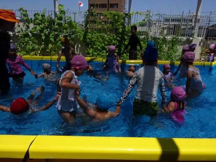 プール遊び 公開日 2023/07/04 更新日 2023/07/04 お知らせ 最後はみんなで、カエルとオタマジャクに分かれて、輪になって回る遊びです。 オタマジャクの子どもたち(しゃがんでいる子どもたち)は、カエル役(立っている友達)に引っ張って、回ってもらいます。 途中で交代して、輪になって回ります。 友達とのつながりを感じ、水の流れを感じ、とても楽しい時間です。 いいね(0)