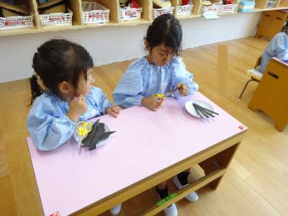 ハサミも少しずつ持ち方が分かってきて、「先生、切っていい?」「おかわりした」とハサミを使う楽しさを感じていました。