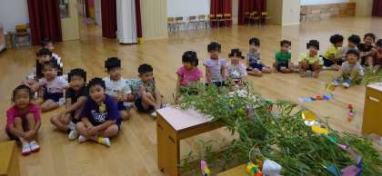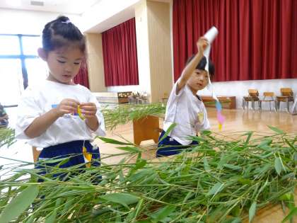 飾り付けた後、大きな笹を見て、「わぁ〜すごい!!」とつぶやいていました。「♪たなばたさま」の歌を歌って、明日の七夕まつりへの期待を高めています。