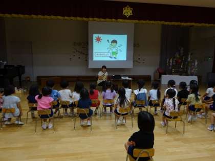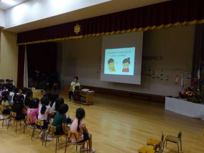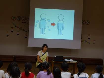 体の水分について、また、水分補給についての話に子どもたちは、難しい「熱中症」という言葉も理解し、聞いていました。