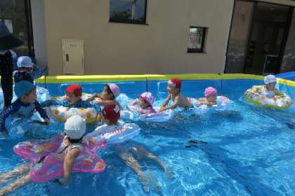 今日は浮き輪に乗って、ジャンプをして、「先生見て〜」と大きな波ができるのを楽しんでいました。また、友達の浮き輪につかまると、長〜くなり「電車みたい!」と喜んで連なっていましたよ!