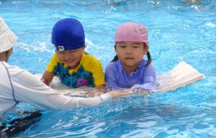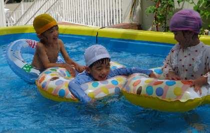 水に顔を少しつけれるようになったり、水がかかっても平気で遊べるようになり、気持ちよさそうにプールに入り、楽しく遊んでいる、ほし組です。友達と一緒に浮き輪で連結して泳いでみたり、お風呂マットに乗って浮いてみたりしながら遊んでいます。