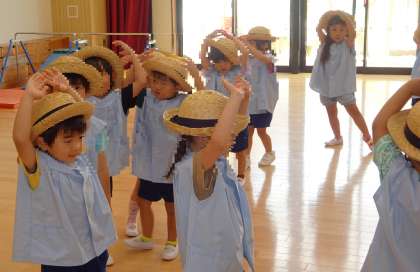 日々、「月夜のぽんちゃらりん」や「ドンパン節」を楽しんで踊っています。今日は広い遊戯室で踊りました。伸び伸びと体を動かし、「タヌキさん〜」「うしろうしろ〜」と踊りの振りを口ずさみながら踊っています。