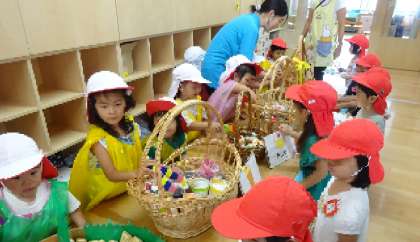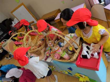 フードコート(3歳児) 公開日 2023/07/17 更新日 2023/07/17 お知らせ お店やさんとお客さんを交代にするフードコートでは、3歳児さんなりの遊び方で楽しませていただきました。 お店やさんは「いらっしゃいませ〜!!」「おいしいドーナツありますよ!」 と元気な声でお客さんを誘っていましたよ! お客さんも、「ポテトください」「どのジュースにしようかな〜」と美味しいご馳走を前に、とても嬉しそうでした。 「先生もどうぞ」とご馳走してくれました。 いいね(0)