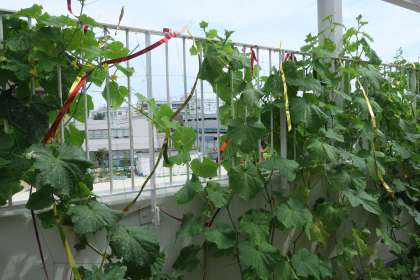 ウッドデッキに植えたキュウリやゴーヤが青々と生長し、緑のカーテンができています。