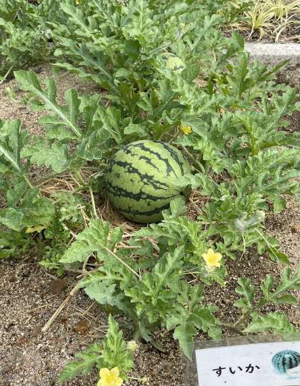 子どもたちが楽しみにしていたスイカ、今年は気候の影響か初期の生育不良に悩まされましたが、ぐんぐん気温が上がるとともに大きくなってきました。