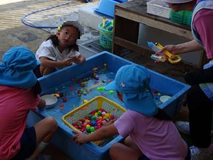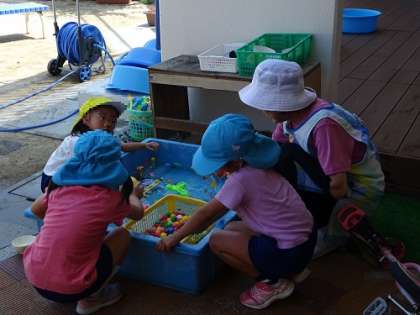 朝とはいえ、とても暑いので日陰で水遊びをしたり、虫に関心を寄せたり…。 元気に遊んでいます!