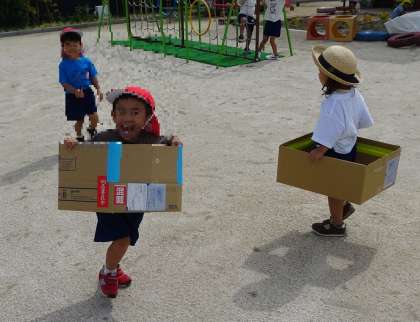 1学期から継続している電車ごっこ。新しく、お友達と一緒に入れる長〜い電車をつくって置いておくと、早速たくさんの子が入って遊んでいました。