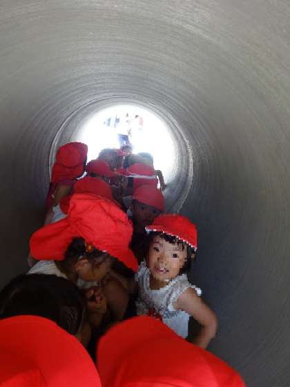 戸外に出るときに、「電車に乗って行きたい!」という子もいたので、戸外に持って遊びに出ました。線路に本物の電車が通ると「先生、一緒だね!」と嬉しそうに教えてくれていました。みんなでトンネルの中へも探検に行きました。