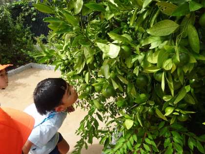 と虫探しをしながら夏には気づかなかった秋の実りに気づいた年長のおともだち。