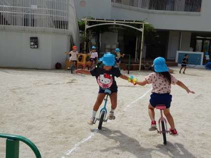 一輪車でメリーゴーランドをしています。これはとっても難しく、友達と息を合わせ、気持ちを合わせないとできませんが何度も挑戦してできるようになっています。