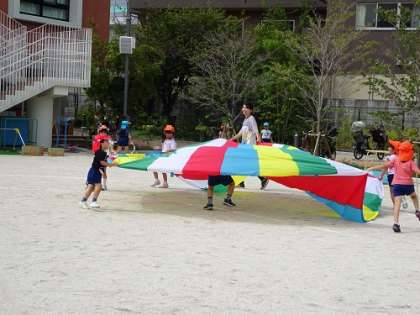 パラバルーンを先生(養護教諭)や友達と自由に遊んでいます。