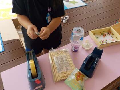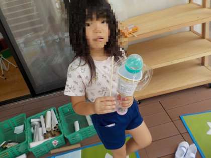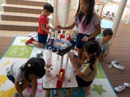 1学期は容器の中に素材を入れて振って楽しむ姿が多かったですが、今日は