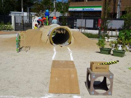 電車ごっこを楽しんでいる子どもたち(3歳児)がトンネルをくぐって遊び、また、出てきて踏切で友達とのかかわりができるようにしかけをしています。