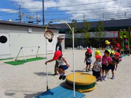 また、4歳児は忍者になって遊んでいるので、修行の場として、ジャンプしたり、タンブリンを鳴らしたりできるようになっています。もちろん、3歳児〜5歳児、誰がどの遊びをしてもいいのです。