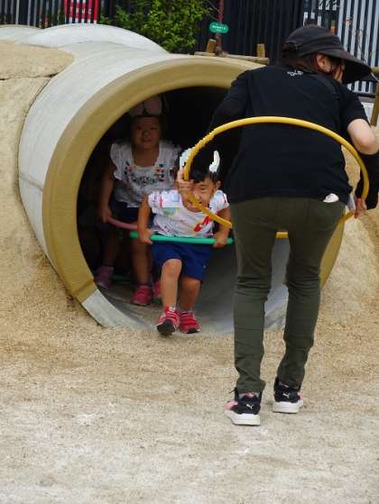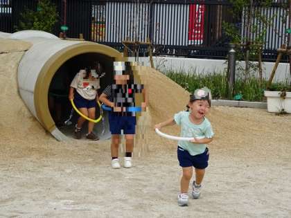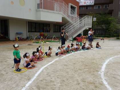園庭を思いっきり走って、バトンをつなぐかっこいい姿を見て応援しています。