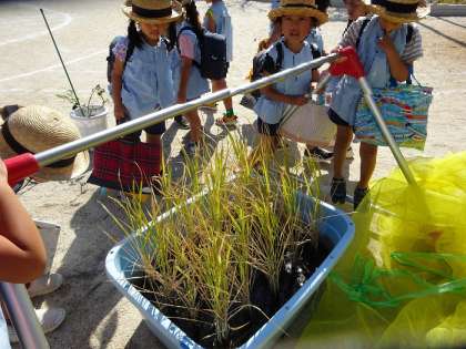 「豊作を願ってお供えをする」と知った後、「幼稚園で育てている里芋と稲の様子を見に行こう!」という話になり、みんなで見にいきました。