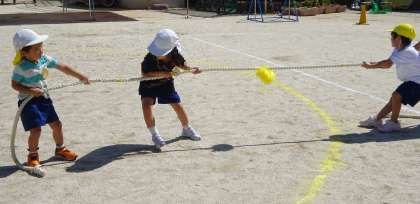 色チーム、白チームに分かれて、綱引きです!一生懸命、綱を引っ張っています。