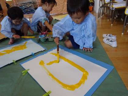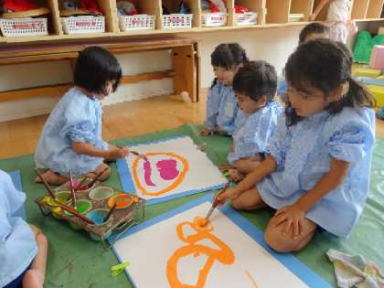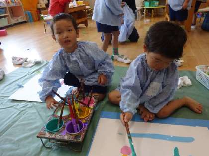 お弁当を食べた後に、絵具を置いておくと、「先生、今日も絵具でおえかきしたいな!」とたくさんの子どもたちがきます。