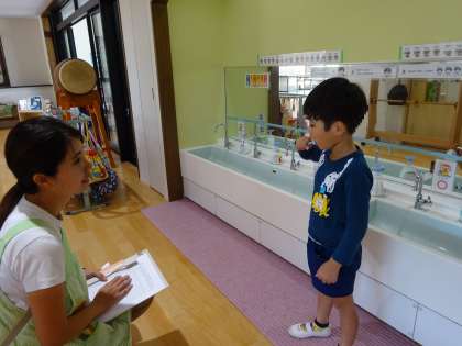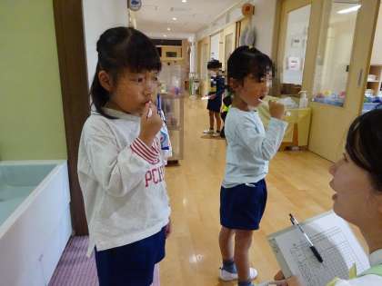 毎日一緒に手本を真似しながらみがいていたので、みがく場所や順番をしっかり覚えてきたほし組の子どもたちは、テストに合格して『はみがき名人』になれるかどうか期待でいっぱいの様子でした。
