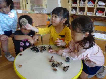 今日は拾ってきたドングリやマツボックリをみんなで見ました。