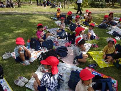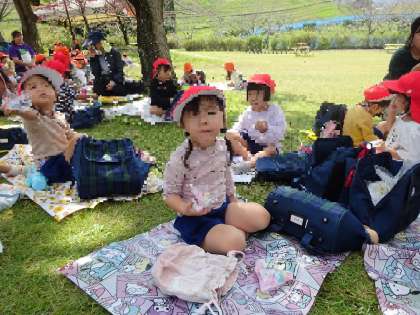 お外で食べるおにぎりは美味しいね!(3歳児)