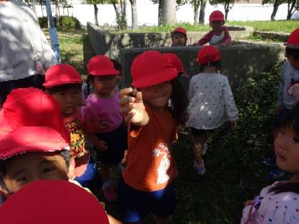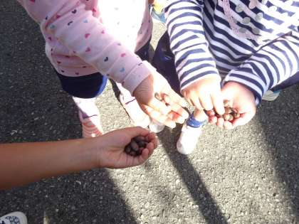 最初はなかなか見つからなかったのですが、よ〜く目を凝らして地面を見てみると、「あった〜!!!」と大喜び。一人が見つけると、その近くにはたくさん落ちていたので、みんなで「私も見つけた!」「こっちにもある」「楽しいな〜」と、ドングリ拾いを楽しみました。「僕だけまだない」という友達に、「ここにあるよ、はい」と優しく教えて拾わせてくれている子もいました。