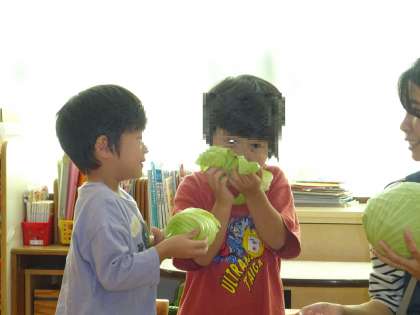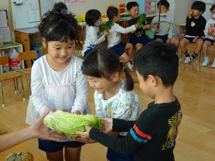 子どもたちは実物の野菜に触れながら、様々な種類の野菜に親しみました。