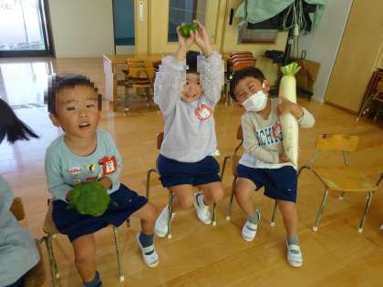 野菜が出てくると、「やさいのおみせや!」と目をキラキラさせ、好きな野菜を選んでお買い物ごっこを楽しみました。