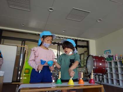 演奏会ごっこ 公開日 2023/10/28 更新日 2023/10/28 お知らせ (数日前の写真です) 運動会後、大太鼓や小太鼓、鍵盤楽器を友達と合わせて遊んでいます。歌も聴かせてくれますよ! 竣工式で梅香中学校の吹奏楽部の方に聴かせていただいた「アメリカンパトロール」がお気に入りです。 打ち方は、自分たちでいろいろ音を出しながら自分たちで考えました。 リズムが合ったり合わなかったり・・・という経験を繰り返しながら 「リズムを感じること」「友達と一緒にする喜び」を感じ始めています。 いいね(0)