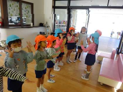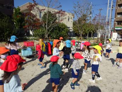 ダンスをしながら、異年齢児同士が関わって遊んでいます。初めは仲の良い友達と手をつないでいましたが、いろいろな曲に触れて遊ぶうちに、周りの友達にも目がいくようになり、異年齢同士で手をつなぎ合ったり、向かい合って教え合ったりするようになってきています。