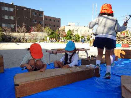 釘をうつのは集中力と根気がいります。でも「こんなのをつくりたい」という思いがあるからこそ、楽しんで遊びに向かいます。写真は友達と協力しながらドングリレースの台をつくっています。「トントントントン」心地よい音を感じながら、時々「かなづちトントンいっぽんでトントン♪」と口ずさんだりもしています。