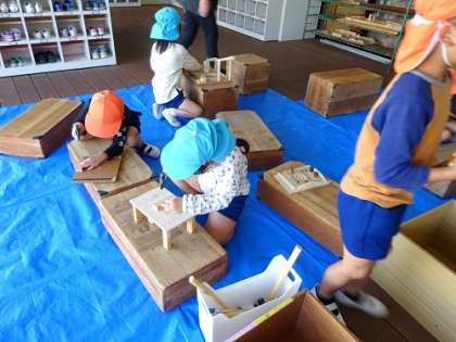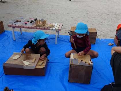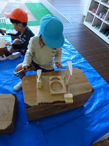 木工遊びに慣れてきて、金槌の音が、しっかり安定しています。