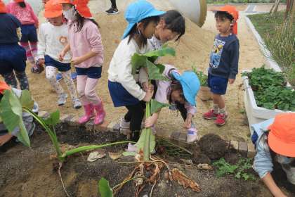 畑で育てたサトイモを、そら・つき組の子どもたちが収穫しました。