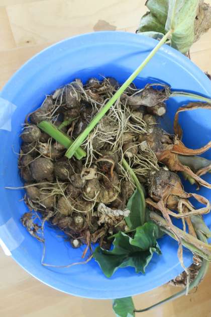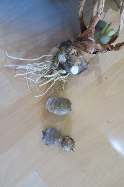 真ん中の大きい芋が親芋、それにくっついている中ぐらいの芋が子芋、子芋にくっついている小さい芋は孫芋です。