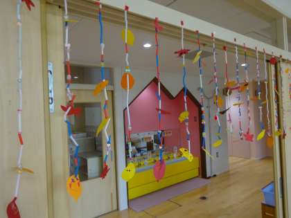 みんなでつくった紐通しをのれんにして飾っています。