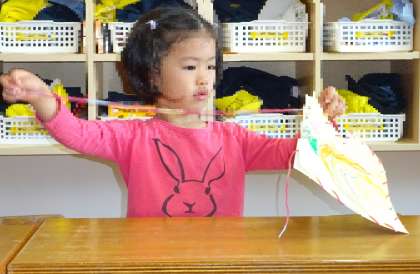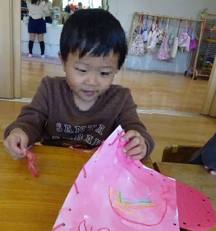 はじき絵したものに穴をあけて、紐通しをしました。「難しい〜!」「次はどうするの〜?」と聞きながら、一生懸命頑張っていました!