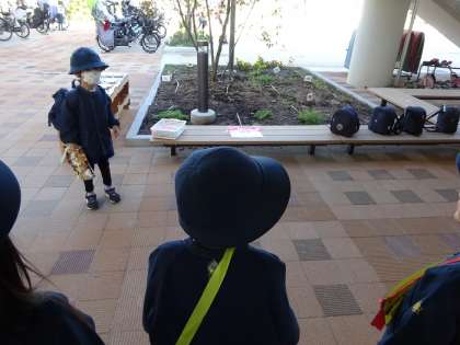 1学期は恥ずかしそうにお家の方の背中にかくれていた子どもたちがたくさんいましたが、この頃は自信をもち、立ち止まって挨拶をかわしています。あいさつっこの成果ですね!