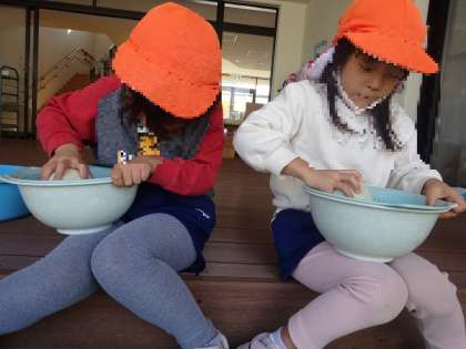 ソフトボールを使ってゴリゴリ頑張ってもみすりをしていました。