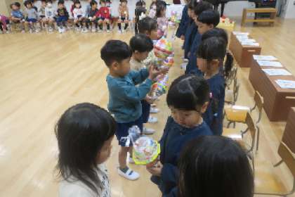 みんなで「どんぐりマン」のダンスを踊ったり、落ち葉を見たりして秋一色の誕生会でした。