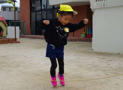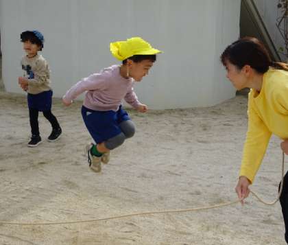 いろいろな遊具に挑戦しているほし組です。今日は大縄跳びに挑戦し、縄を見ながら跳んだり、友達と一緒に跳んだりして遊ぶことを楽しんでいます!引っかかっても何度も挑戦しながらできた喜びを感じています。