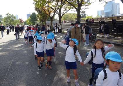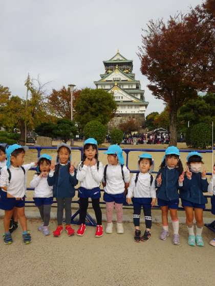 ドングリを拾いながら天守閣に向かい、天守閣の上からしゃちほこを眺めたり、下で荷物を見守ってくださっている事業担当主事さんに手を振ったりして楽しんでいました。