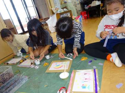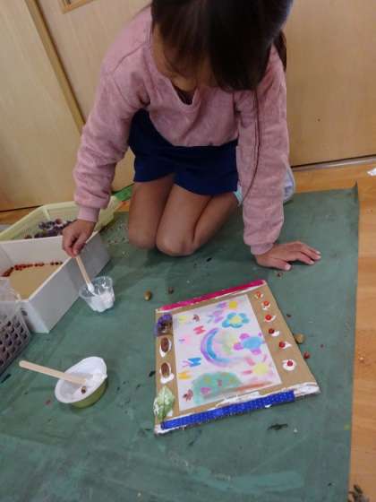 園庭で拾ったナンテンや、大阪城公園で拾ったドングリや枝をつかって製作をしました。