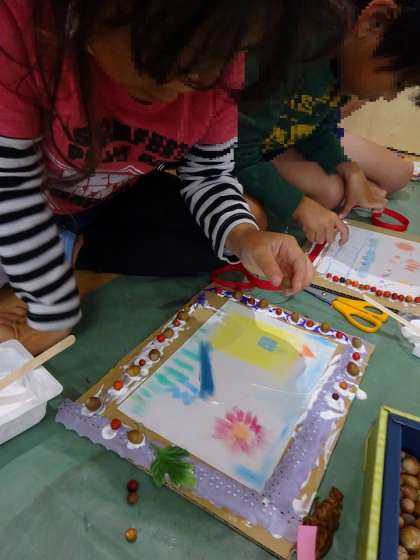 指でかいたコンテ絵のやさしい感じと、秋の自然物がちょうど合っており、素敵な作品ができました。